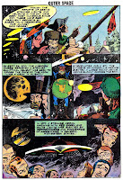 From Charlton's OUTER SPACE #19 [1958] comes the 5-page "What Are The Flying Saucers?". Not really a story but a survey of UFO sightings, ending with the 1952 Sutton Monster, which seems to be better known as the Flatwood Monster these days. Ditko's visualization of that one is actually a bit of a let-down, when compared to the great image he has on the first page. That ominous bit on the bottom of page 2 is also really good.